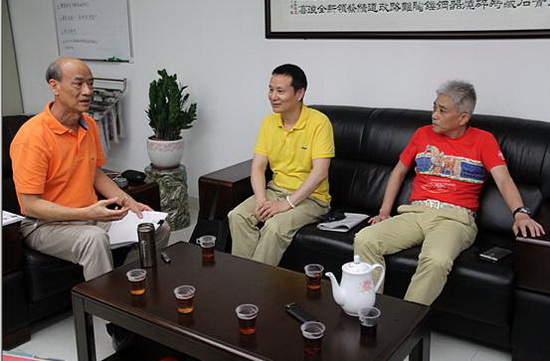 《建材天地》社长罗青(中)采访粉色视频网站APP入口免费企业副总欧家瑞(左一)